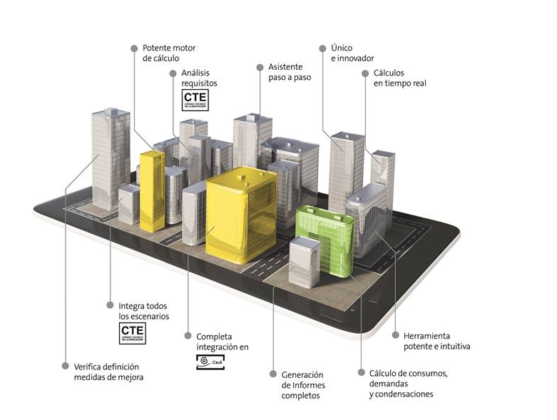 Una vez se encuentra definido el edificio en CE3X para su calificación energética, con este complemento se puede realizar un análisis del grado de cumplimiento de los requisitos del CTE a través de un sencillo asistente: |