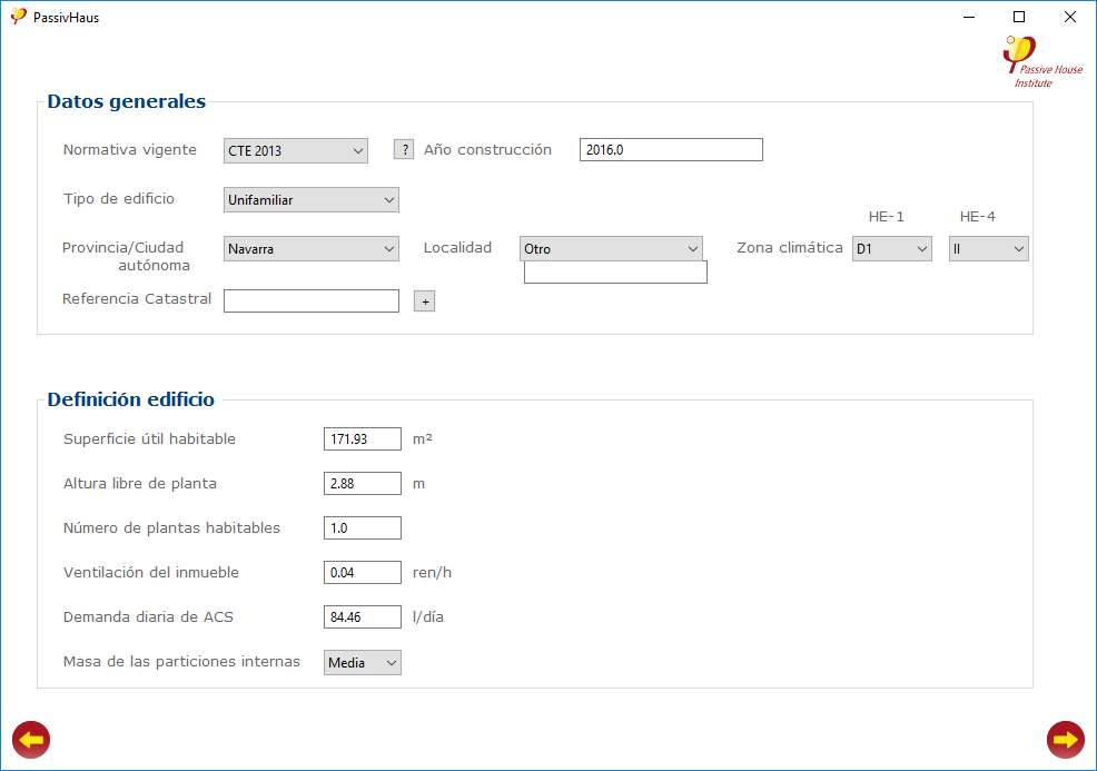 Esta pantalla se encontrará parcialmente rellenada con datos obtenidos de la hoja PHPP. El técnico deberá rellenar los datos que falten y comprobar la validez de todos. En especial, deberá comprobar que los siguientes datos son los adecuados en el ámbito de la verificación del CTE y de la certificación energética: