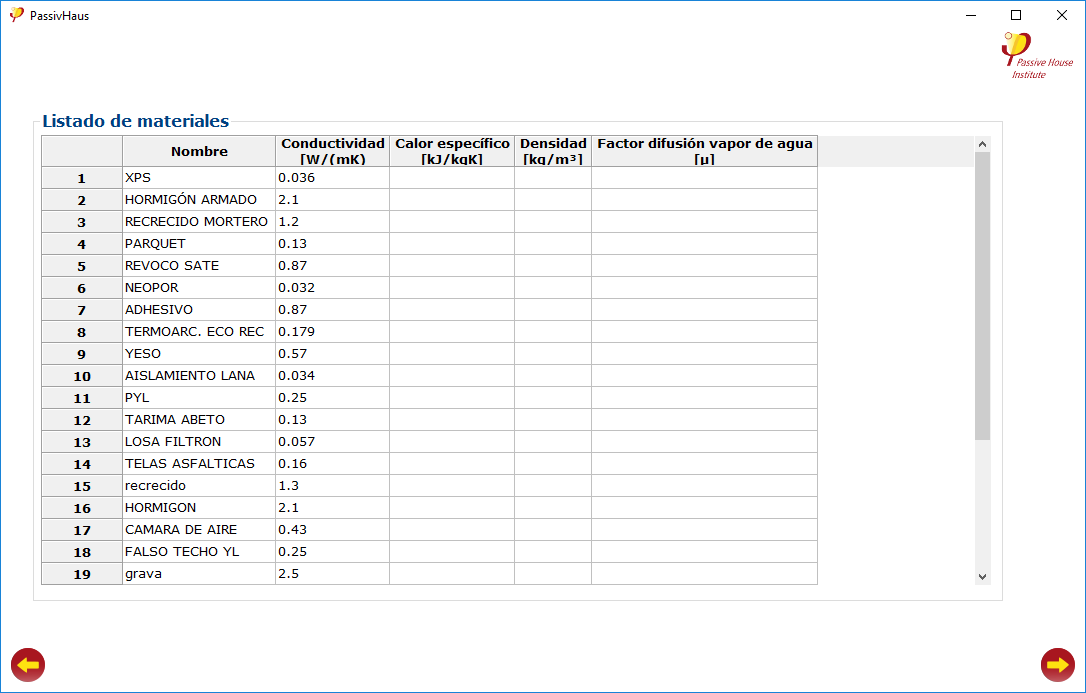 En esta tabla aparecerán los materiales definidos en la hoja del PHPP y se puede completar o no. Si se completa, los sistemas constructivos asignados a los cerramientos estarán definidos por sus capas y se podrá hacer la comprobación de las condensaciones intersticiales con el complemento adecuado. Si no se completa, los cerramientos estarán defindios por la transmitancia térmica definida en el PHPP y una masa de 200 kg/m². En este último caso no se podrá hacer la verificación de las condensaciones interstiticiales.