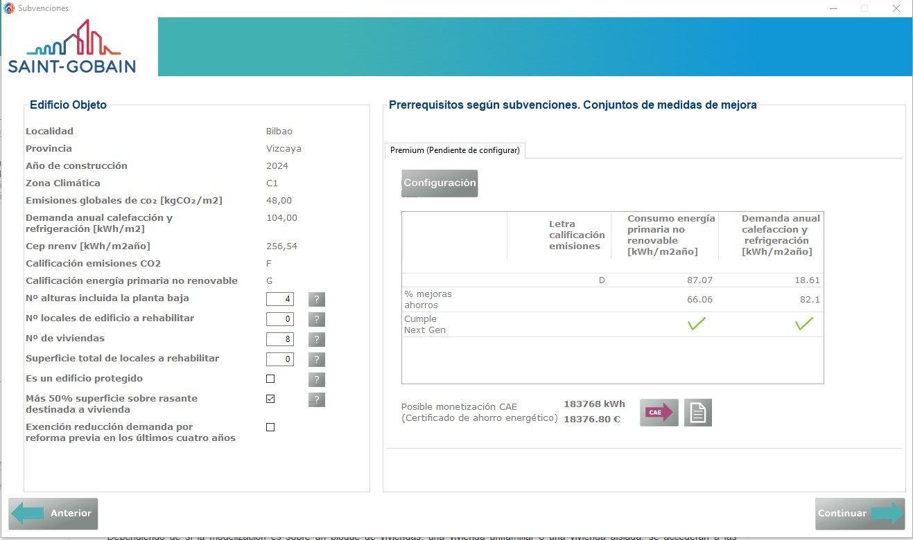 El complemento sgSubvenciona está integrado dentro del programa Ce3x, esto permite al técnico realizar la certificación energética del edificio, la comprobación del cumplimiento del CTE DB HE (spConecta e sgAnaliza), la conclusión de medidas de mejora para la rehabilitación (Complemento Saint-Gobain) y el análisis de los diferentes escenarios y posibles subvenciones a las que se tiene acceso con la rehabilitación planteada, con un asesoramiento en la selección e instalación de sistemas para la mejora de la eficiencia energética.