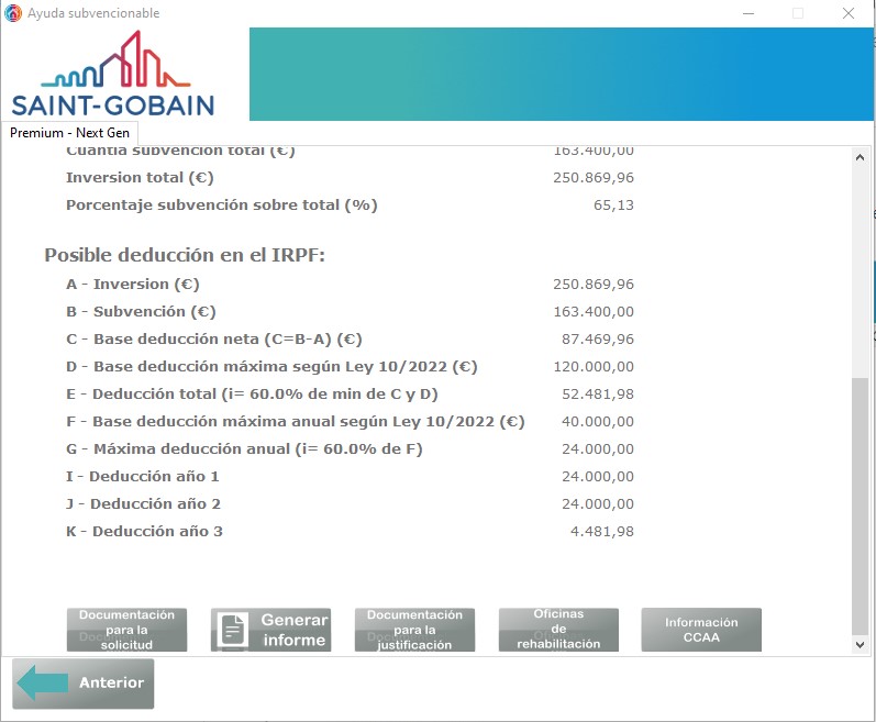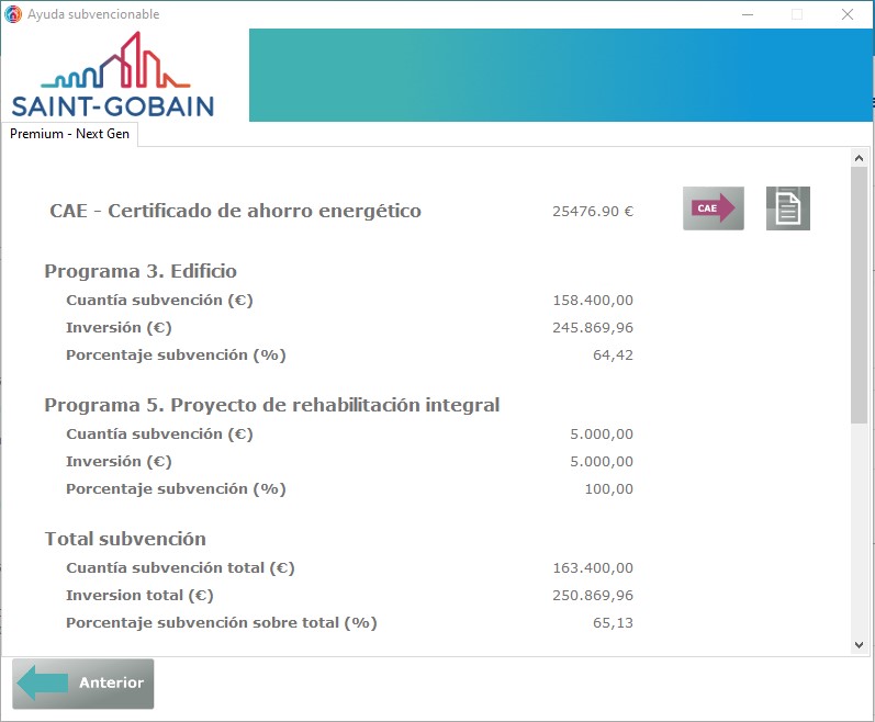 Una vez se han introducido los datos del edificio y configurado las diferentes medidas de mejora, el complemento ofrece la información de las subvenciones a las que podemos acceder dependiendo de la situación del edificio y la medida de mejora implementada.